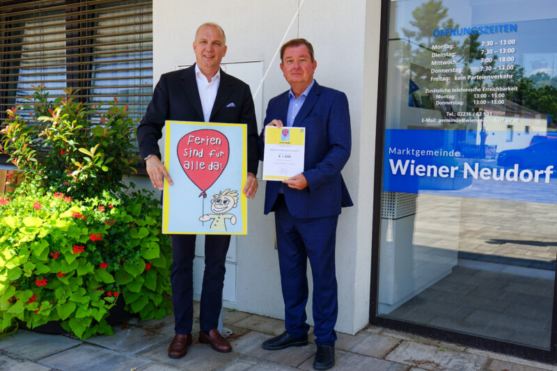 Im Juli überreichte Bürgermeister Herbert Janschka eine Spende der Marktgemeinde Wiener Neudorf in Höhe von 1.000 als Beitrag zur Ferienaktion 2025. Bezirkshauptmann Dr. Philipp Enzinger bedankte sich herzlich für das großzügige Engagement (am Foto links).
