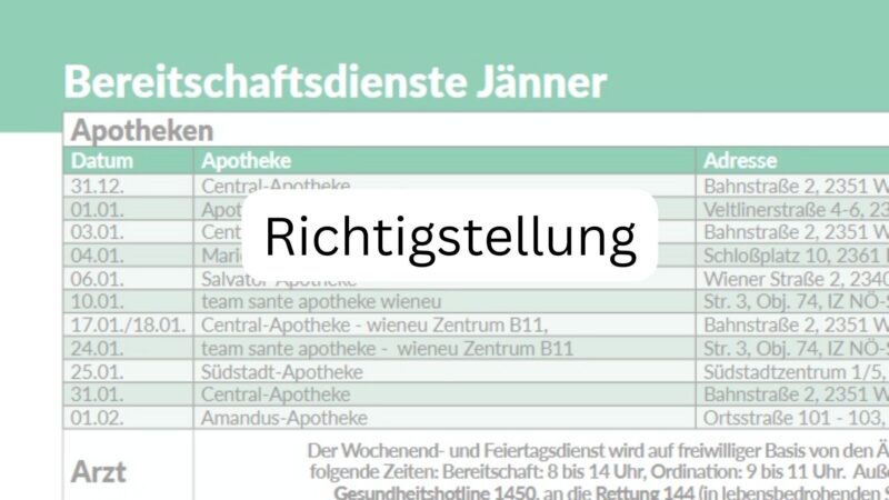 In der letzten Gemeindezeitung haben sich auf Seite 22 bei den Bereitschaftsdiensten der Apotheken aufgrund des Jahreswechsels leider einige Fehler eingeschlichen. Zur besseren Orientierung stellen wir hier die korrekten Termine ab 7.1. bereit. Wir danken für Ihr Verständnis und bitten die Unannehmlichkeiten zu entschuldigen.