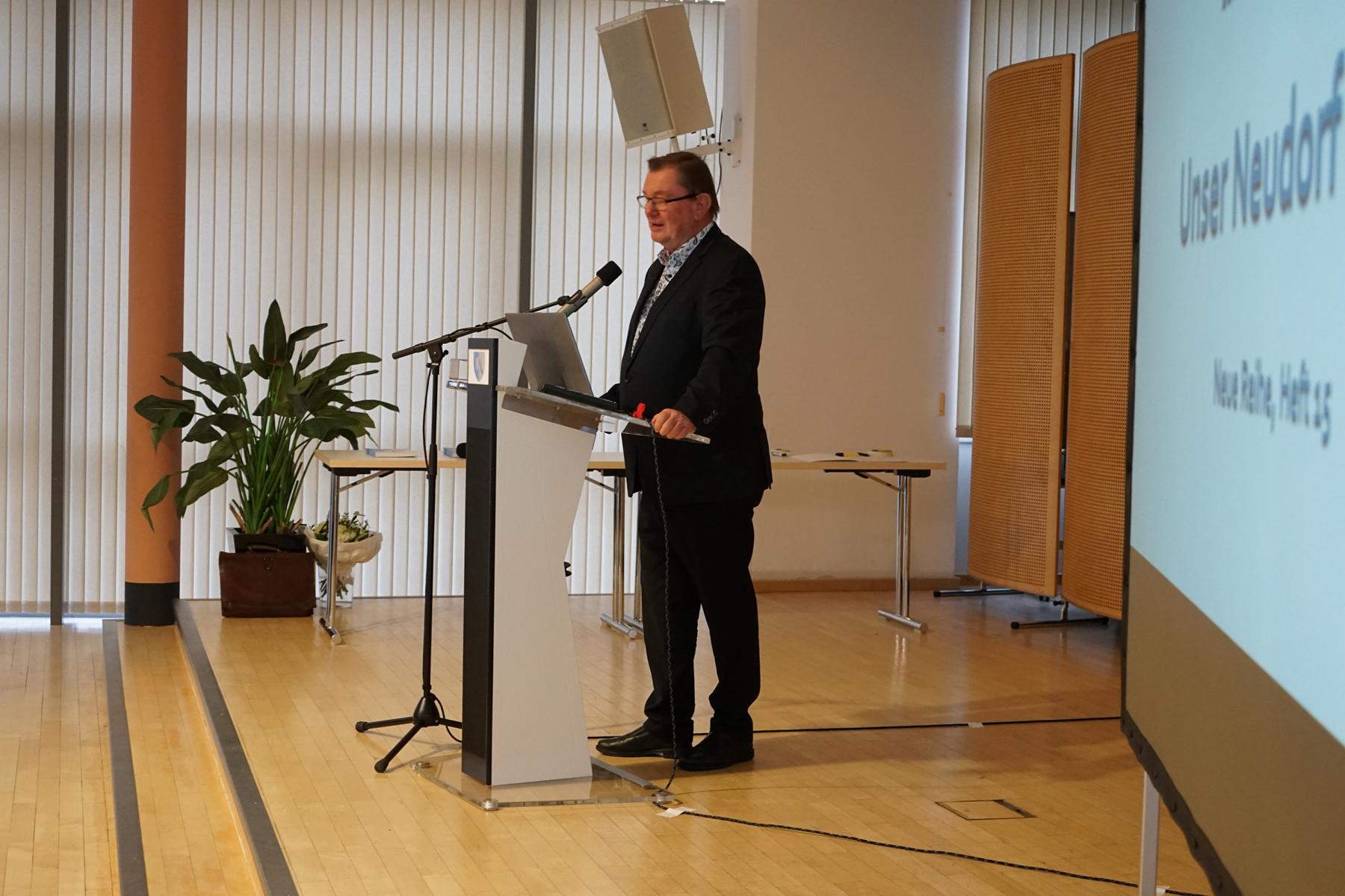 Durch die Veranstaltung führte Arntrud Prokop, die gemeinsam mit Josef Tutschek seit einem Jahr die Leitung des Archivs innehat. Viele kennen Arntrud Prokop als jahrelange Mitarbeiterin unserer Gemeindebücherei und in den letzten Jahren bereits als Kollegin im Archiv. Josef Tutschek gehört durch seine frühere Tätigkeit als Bezirksschulinspektor und langjähriger Vize-Bürgermeister ohnedies zu den bekannten Persönlichkeiten unserer Gemeinde. In ihren Vorträgen würdigten Sie ihrem Vorgänger, HR Dr. Peter Csendes, seine exzellente fachliche Expertise und sein langjähriges Engagement, das bis heute nachwirkt.