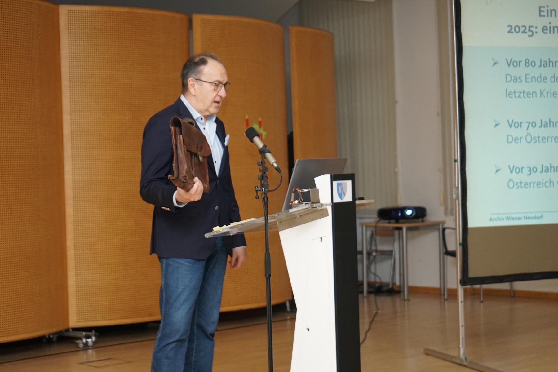 Ein spezieller Programmpunkt war der Vortrag von RegR Josef Tutschek, der die Entstehung des Mahnmals in Wiener Neudorf nachzeichnete und eindrucksvolle Einblicke in das Schaffen von Prof. Arik Brauer bot, der das Mahnmal im heutigen Park der Erinnerung gestaltet hatte. Das Projekt entstand im Zuge der umfassenden historischen Aufarbeitung des Gedenkens an die Insassen des ehemaligen Konzentrationslagers an diesem Standort.
