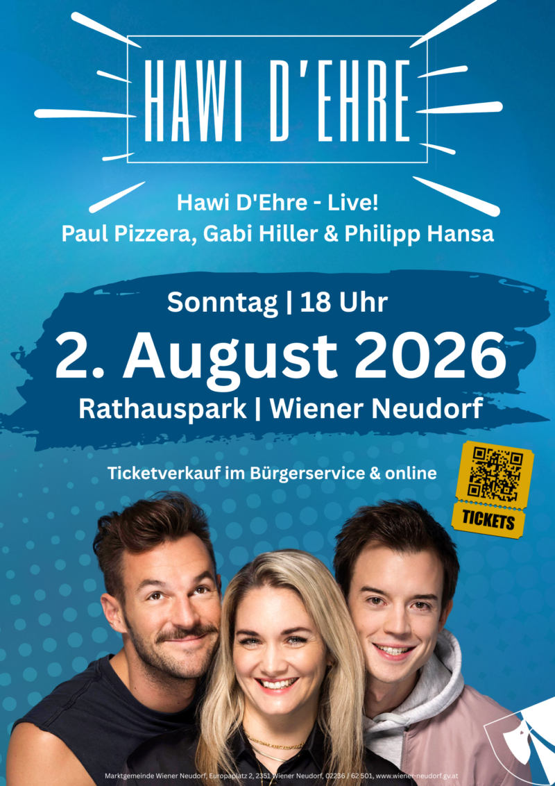 Sollte aufgrund von unvorhersehbaren Ereignissen eine Absage dennoch nötig sein, informieren wir darüber rechtzeitig am Veranstaltungstag. Über eine Absage informieren wir auf unserer Website sowie über SMS-Infoservice (Anmeldungunter https://www.wiener-neudorf.gv.at/service/automatische-benachrichtigungen/sms-infoservice/)), APP & Social Media.Personen, die Karten online gekauft haben, erhalten zusätzlich eine E-Mail.