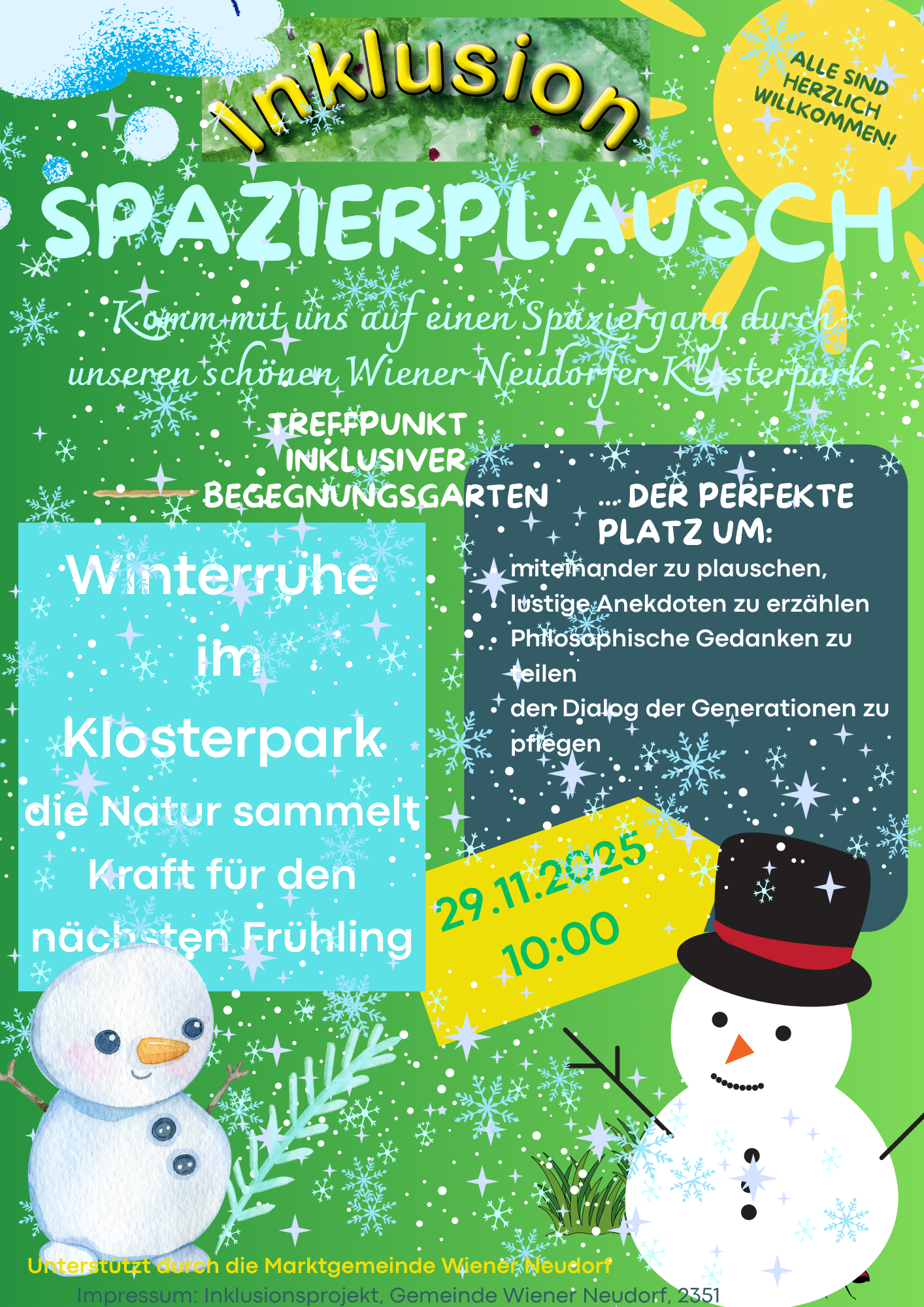 Komm mit uns auf einen Spaziergang durch unseren schönen Wiener Neudorfer Klosterpark. ca. 1,5 Stunden. Treffpunkt: Inklusiver Begegnungsgarten.