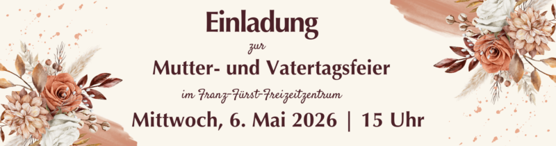 Bürgermeister Herbert Janschka und Kulturgemeinderat Nikolaus Patoschka freuen sich, Sie zur gemeinsamen Mutter- und Vatertagsfeier für Pensionist*innen in den Festsaal des Franz‑Fürst‑Freizeitzentrums (Eumigweg 1–3, 2351 Wiener Neudorf) am Mittwoch, 6. Mai 2026, um 15 Uhr einzuladen.