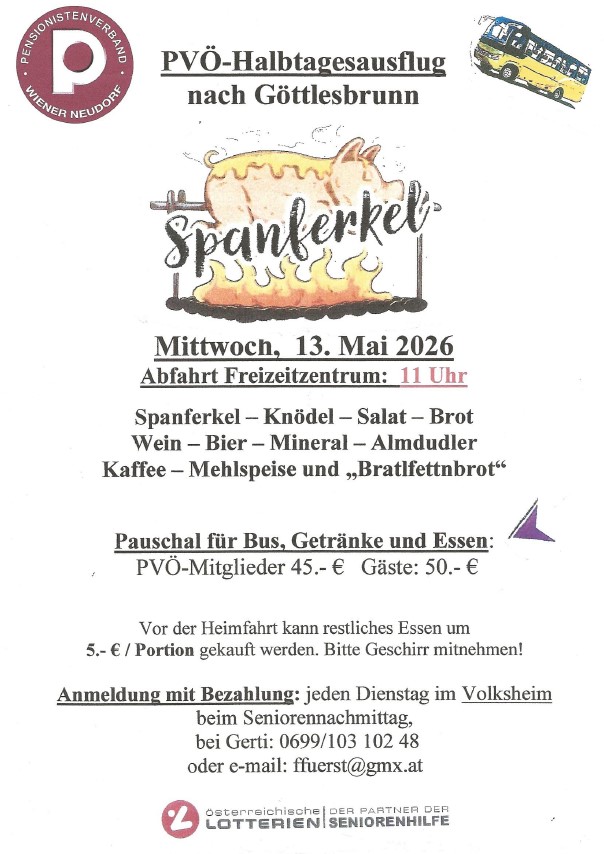 Anmeldung bei Gerti unter 0699/103 10248. Abfahrt 11 Uhr beim Freizeitzentrum. Kosten: PVÖ Mitglieder € 45,-, Gäste € 50,-.
