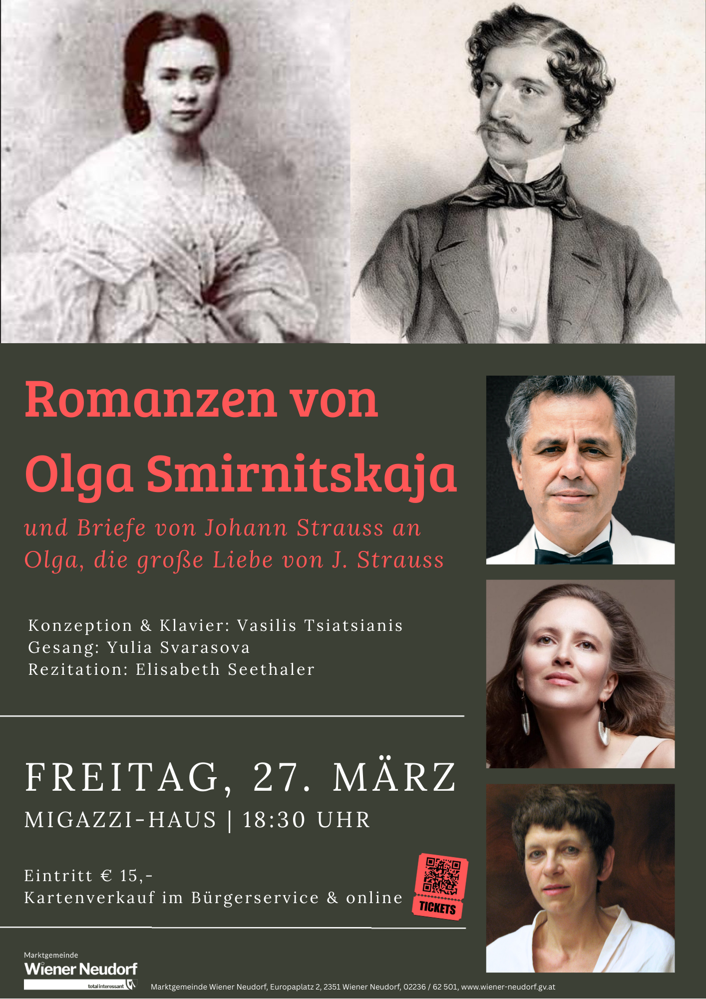 Details: Anlässlich des „Tages der Frau“ im März lädt die Gemeinde zu einer besonderen literarisch-musikalischen Veranstaltung ins Migazzi Haus ein. Im Mittelpunkt steht die russische Komponistin Olga Smirnitskaja, eine der ersten Frauen ihres Fachs, deren künstlerischer Weg im Russland des 19. Jahrhunderts bemerkenswert war.